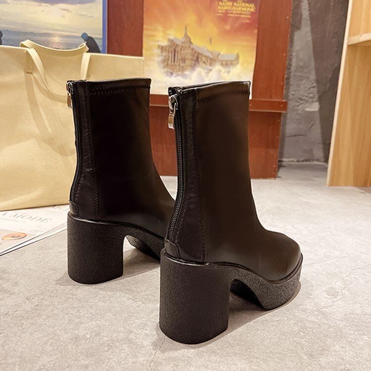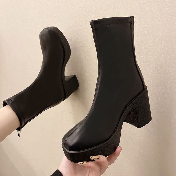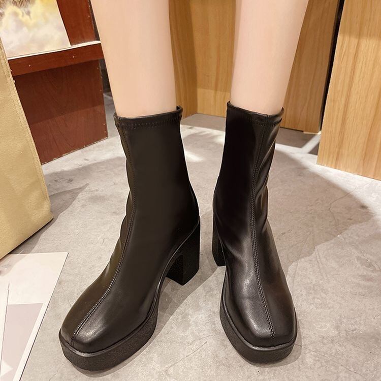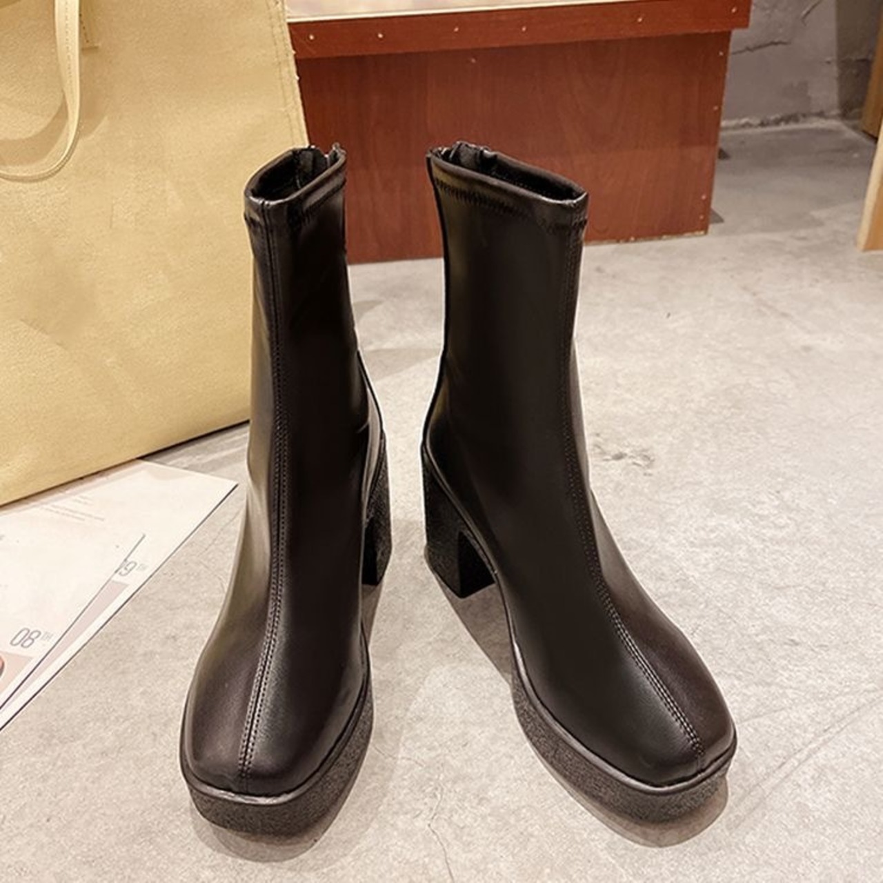 スクエアトゥ ブーツ レディースブーツ 太ヒール 美脚 合皮 歩きやすい カジュアル 大人秋冬 韓国 履きやすい