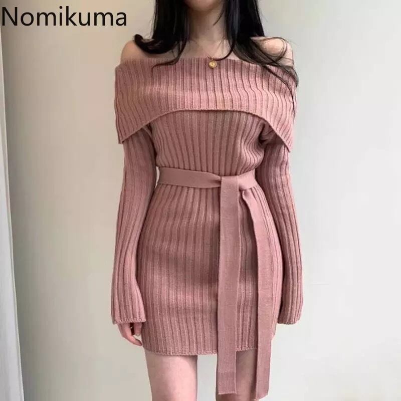 女性用ニットミニドレス,韓国スタイル,シック,セクシー,プリーツ,スラッシュカラー,長袖,スリムウエスト,