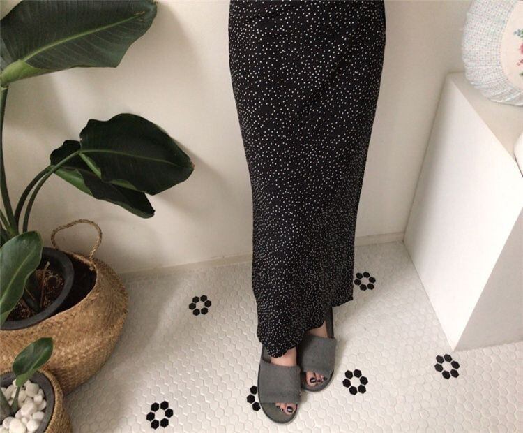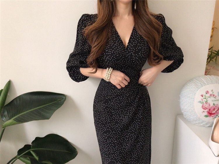 韓国ファッション スリムフィット 小さなドット バンディング パフスリーブ Vネック ロング ワンピース