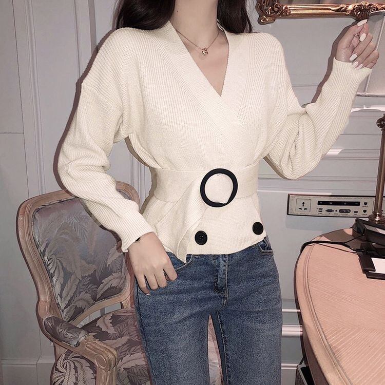 春秋冬コーデに華やかさと可愛らしさを添えてくれるウエストマークニットカーディガン