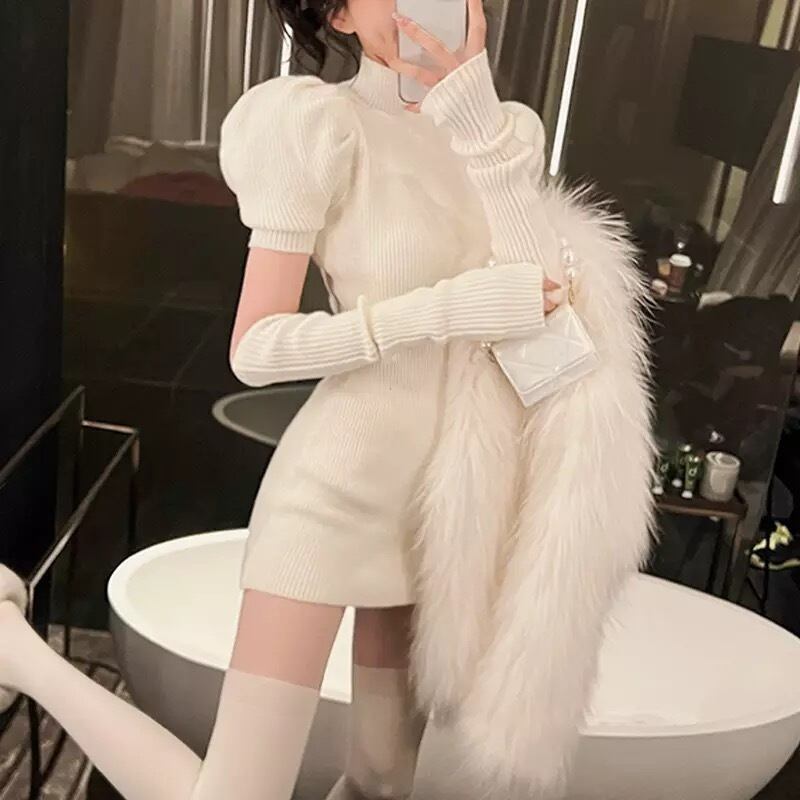 レッグウォーマー付きパフスリーブニットミニワンピ♡