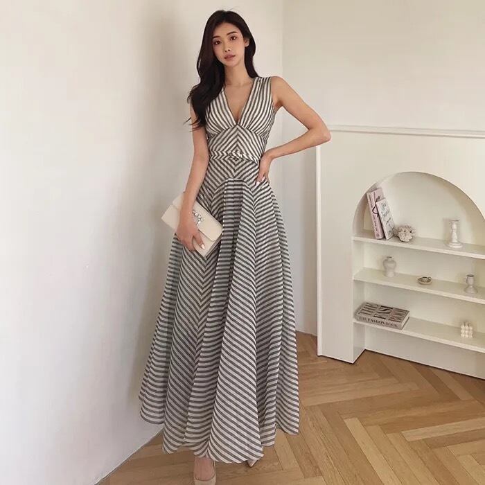 シンプルながらも上品でオシャレなストライプVネックワンピースが登場しました!キュート&フェミニンなデザインは、どんなシーンでも一目置かれる存在感を放ちます。程よいVネックでデコルテを美しく引き立たせ、スタイリッシュな印象を与えます。軽やかな素材で作られているため、動きやすく着心地も抜群です。 大人っぽい雰囲気を演出できる一枚でありながら、カジュアルなコーディネートにもピッタリです。ドレッシーな場面からデイリーコーデまで、さまざまなシーンで活躍してくれます。自信を持っておススメするワンピースですので、ぜひ一度お試しください! ※サイズに関しては、ご注文前に必ずサイズチャートをご確認ください。