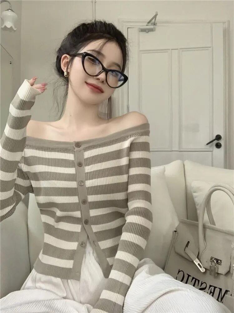 柔らかな肌触りのオフショルボーダーカーディガンが登場しました♡ ボーダーデザインがトレンド感を演出し、女性らしいシルエットが魅力です。オフショルダーで肩を華麗に見せることができ、女性の魅力を引き立てます。軽やかな素材で、一枚で着ても涼しく、羽織りとしても使える便利なアイテムです。さまざまなシーンで活躍すること間違いなしです。是非、このカーディガンで素敵なコーディネートを楽しんでください♡