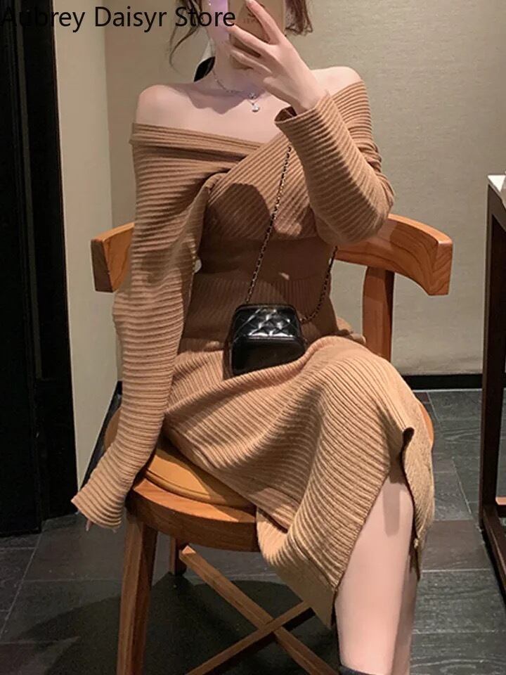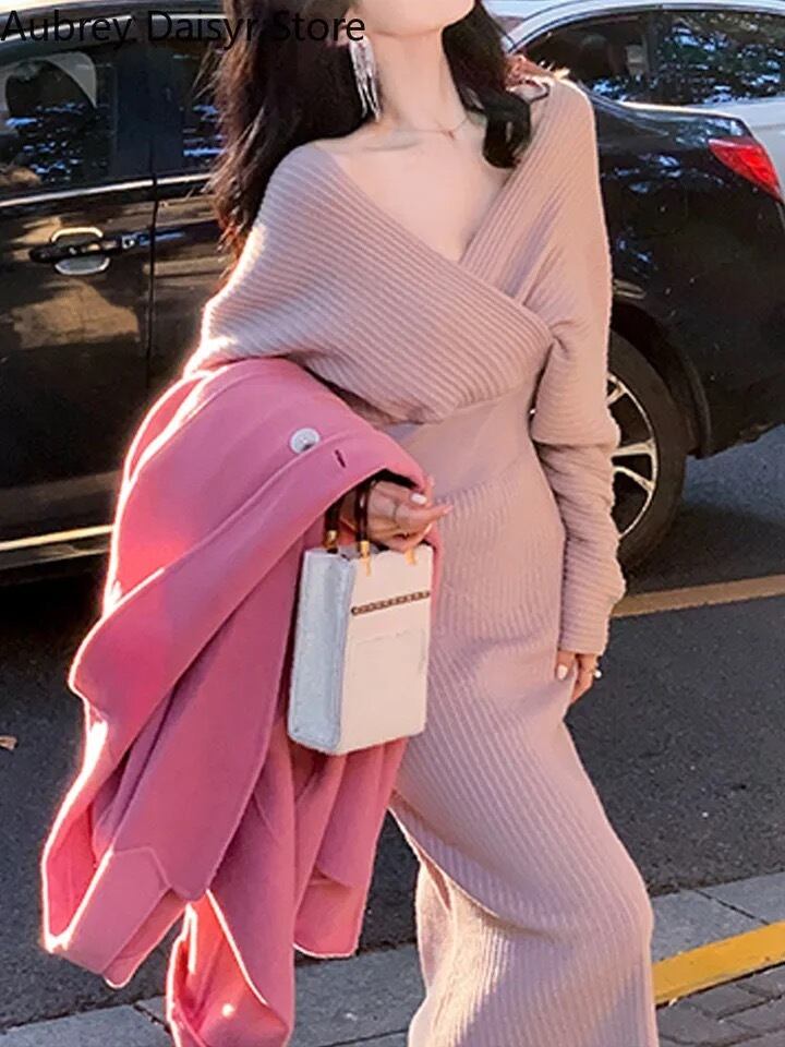 控えめなデコルテと女性らしいシルエットが魅力のカシュクールVネックニットタイトワンピース。フィット感のあるデザインが、スタイルを引き締めてくれる一着です。