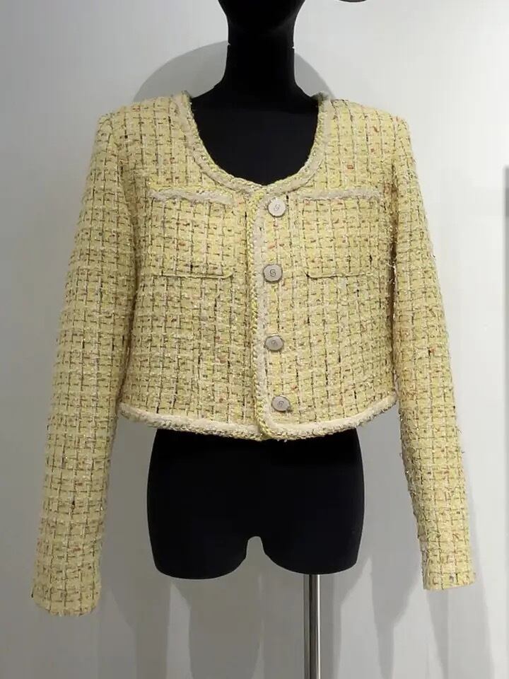 イエローツイードジャケット♡ -||- イエローツイードジャケット♡は、秋冬のおしゃれをお楽しみいただくために生まれました。暖かみのあるイエローカラーが目を引く一着で、上品さと華やかさを兼ね備えています。ツイード生地が高級感を醸し出し、着るだけでコーディネートが格上げされること間違いなし! -||- ファッション愛好家でもある私たちが、日本の季節感やトレンドを取り入れたイエローツイードジャケット♡を製作しました。どんな場面でも活躍する一着で、周りの視線を引きつけること間違いなし! -||- このイエローツイードジャケット♡を身にまとうと、まるで街中がランウェイのような気分に浸れることでしょう。自信に満ちた姿勢で、魅力的なあなたを演出できることをお約束します。ただし、濡れた場所や濡れた状態での着用はお控えください。