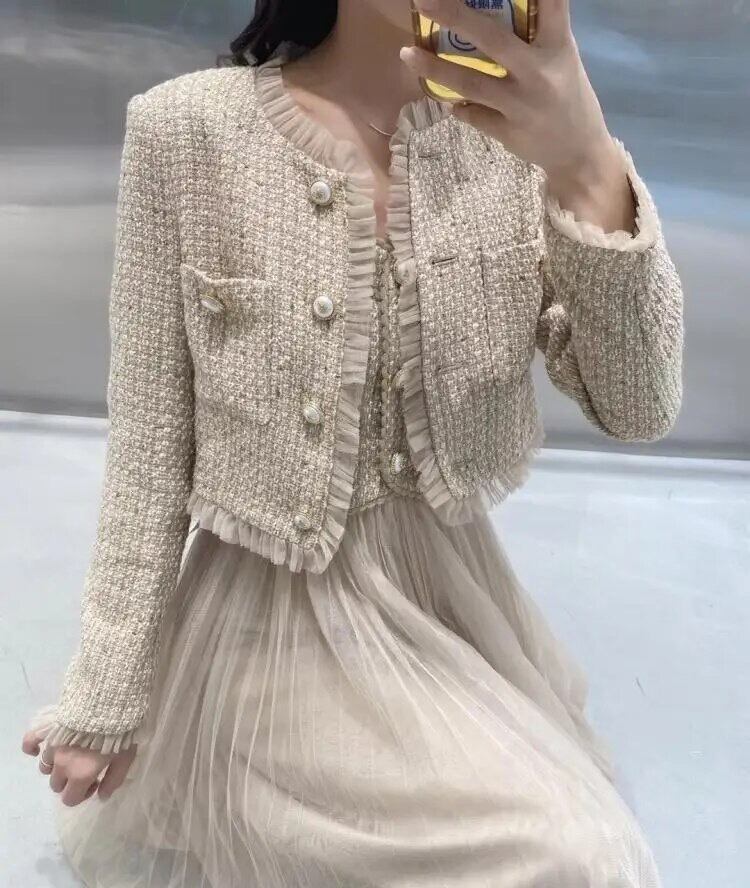 ジャケットチュールワンピースセットアップ♡は、女性らしさを引き立てるチュール素材のワンピースに、今年らしいデザインのジャケットが一緒になった特別なセットアップです。目を引く膝丈のワンピースは、動くたびに揺れるチュールが上品な印象を演出してくれます。さらに、トレンドのフレア袖やVネックデザインが女性らしさを引き立て、周囲の視線を釘付けにすること間違いありません。